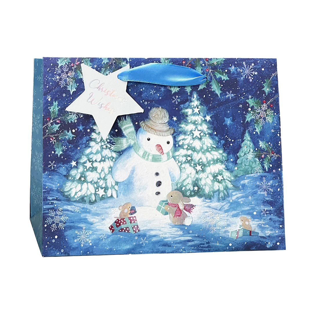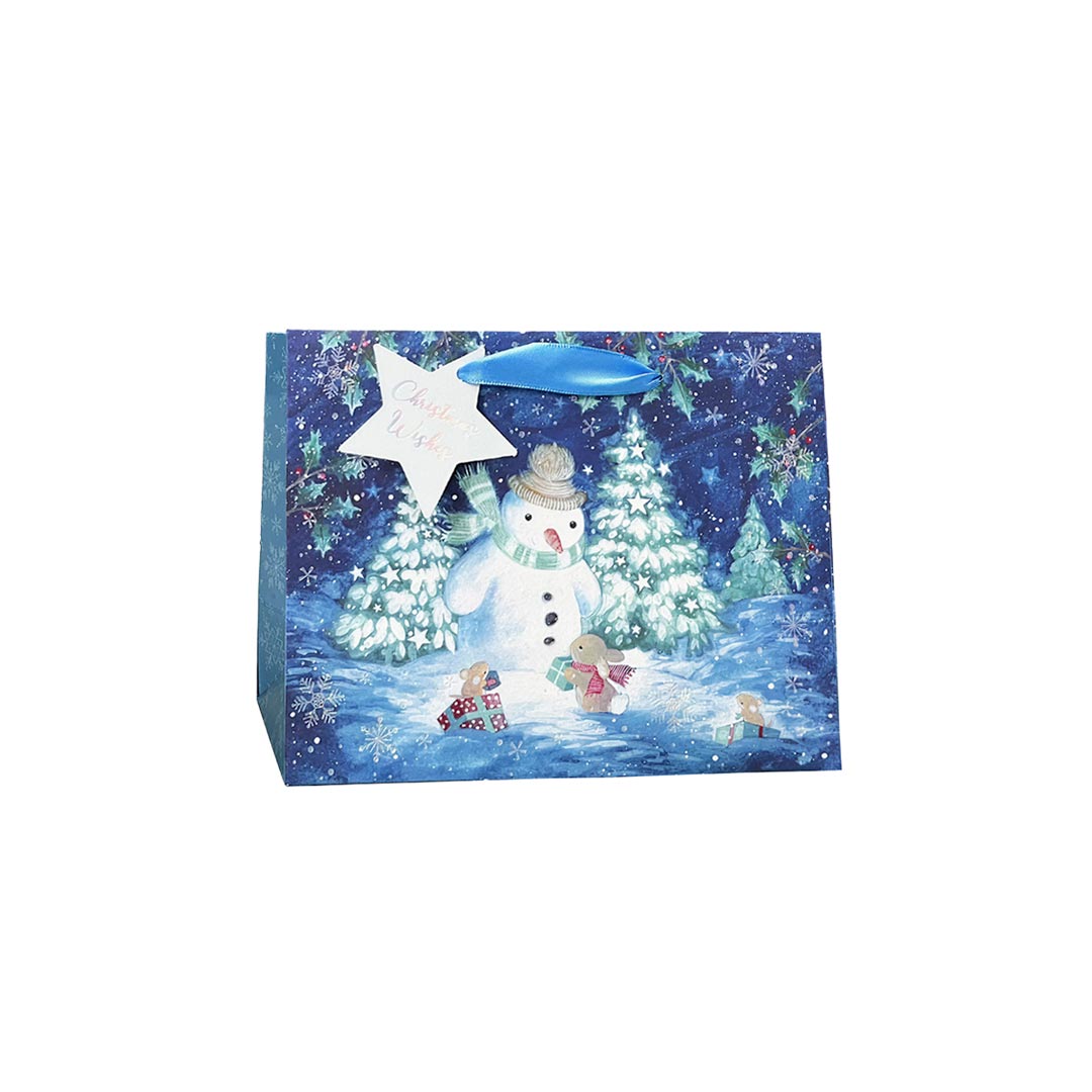 Sacs-cadeaux ornés d’un bonhomme de neige bleu joyeux, parfaits pour les cadeaux des Fêtes. Leur décor hivernal coloré ajoute une touche saisonnière amusante tout en gardant les présents bien emballés.DÉTAILS TECHNIQUES