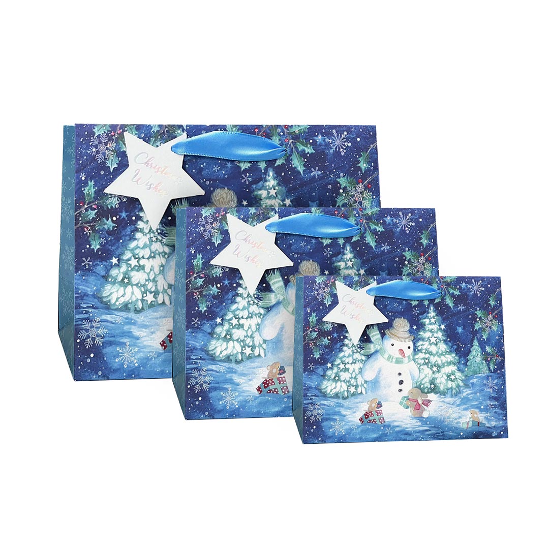 Sacs-cadeaux ornés d’un bonhomme de neige bleu joyeux, parfaits pour les cadeaux des Fêtes. Leur décor hivernal coloré ajoute une touche saisonnière amusante tout en gardant les présents bien emballés.