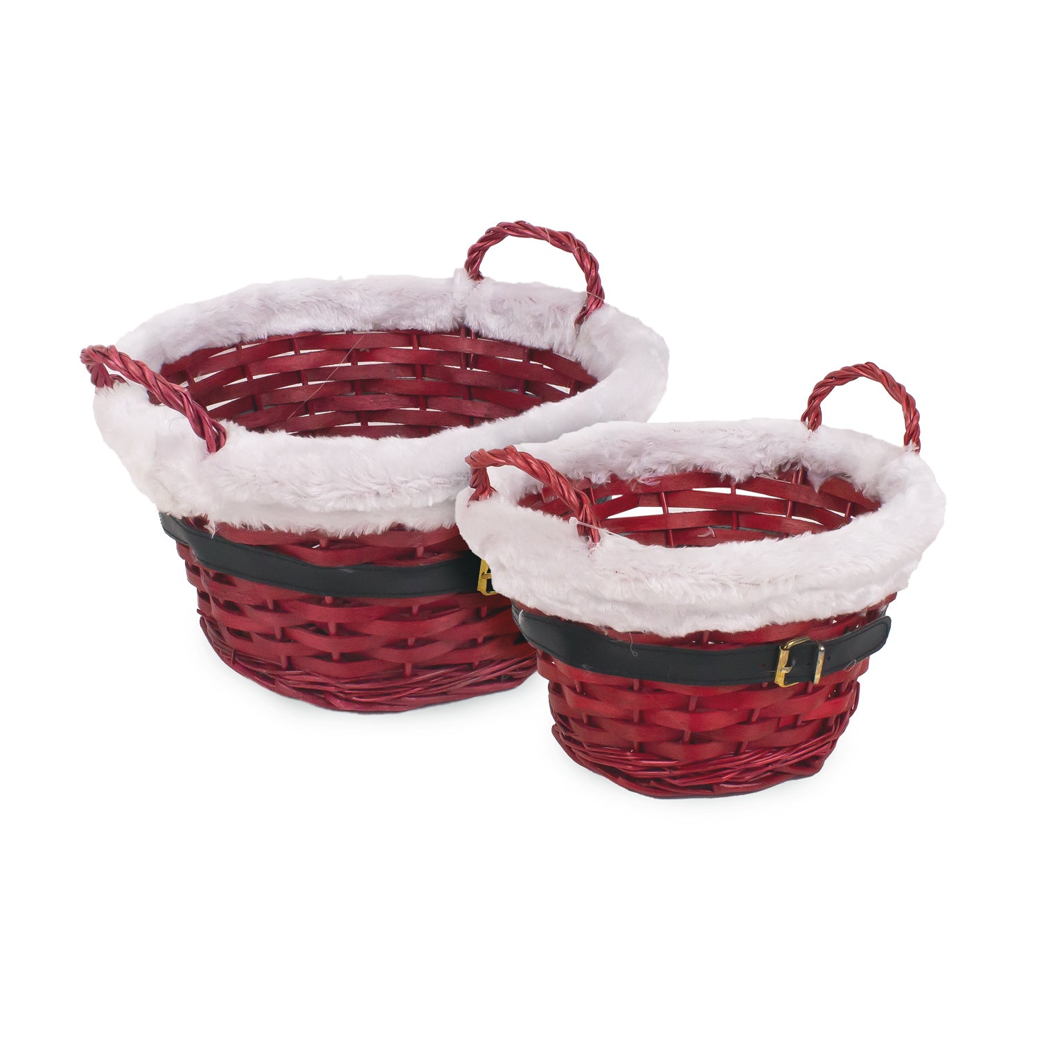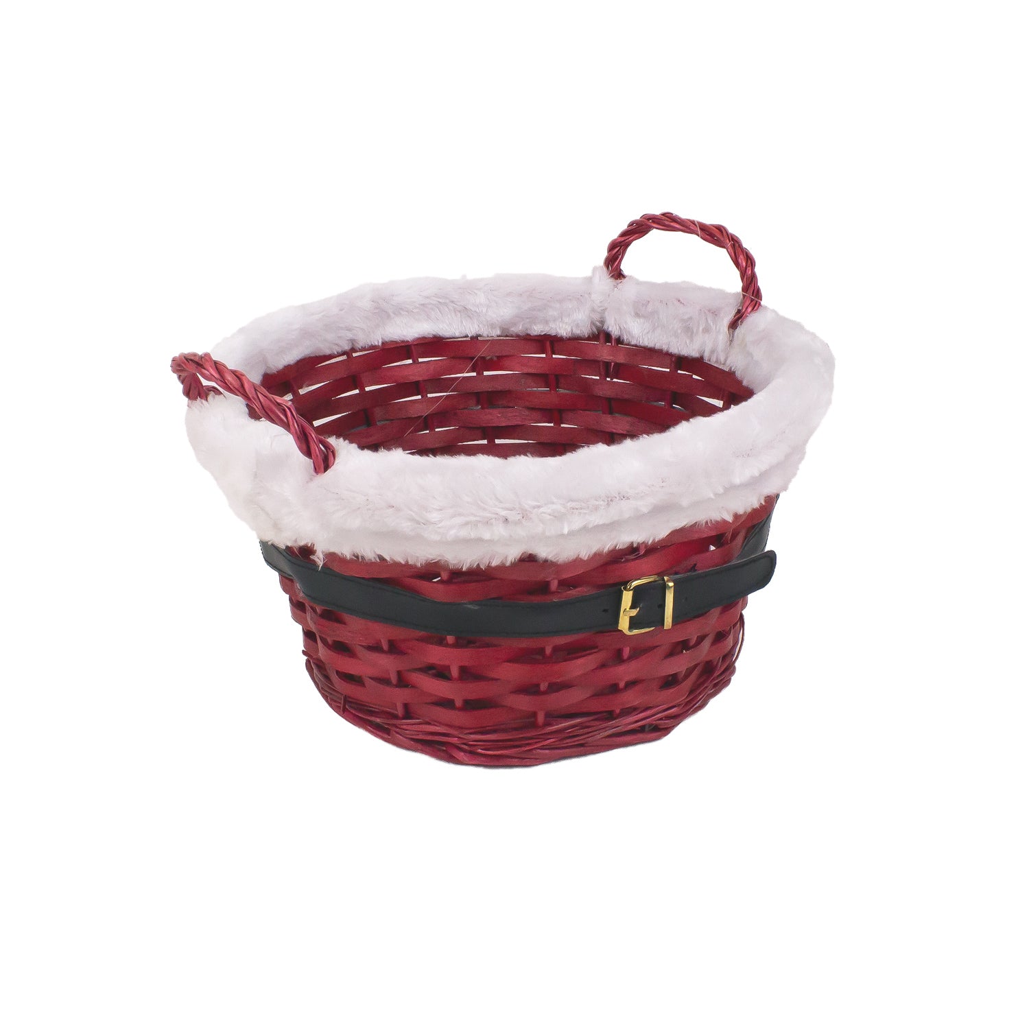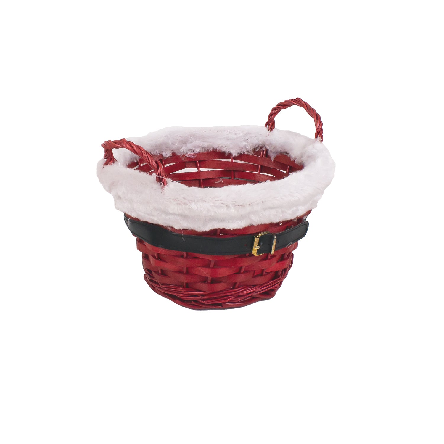 Ajoutez une touche festive à vos emballages avec ces paniers rouges inspirés du Père Noël, ornés de garnitures en fausse fourrure blanche et d’une ceinture noire. Disponibles en plusieurs tailles.