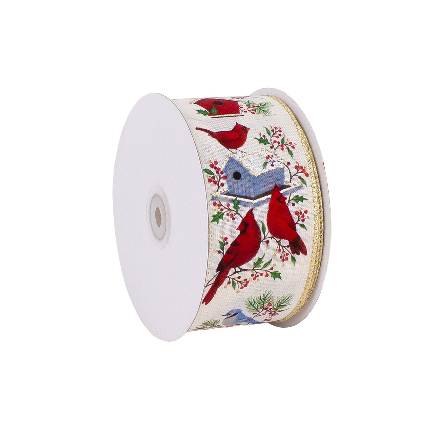 Celebrate the season with this charming winter bird ribbon! Featuring vivid red cardinals, holly branches, and a cozy birdhouse on cream fabric with gold trim. Perfect for wreaths, garlands, and nature-inspired gift wrapping.