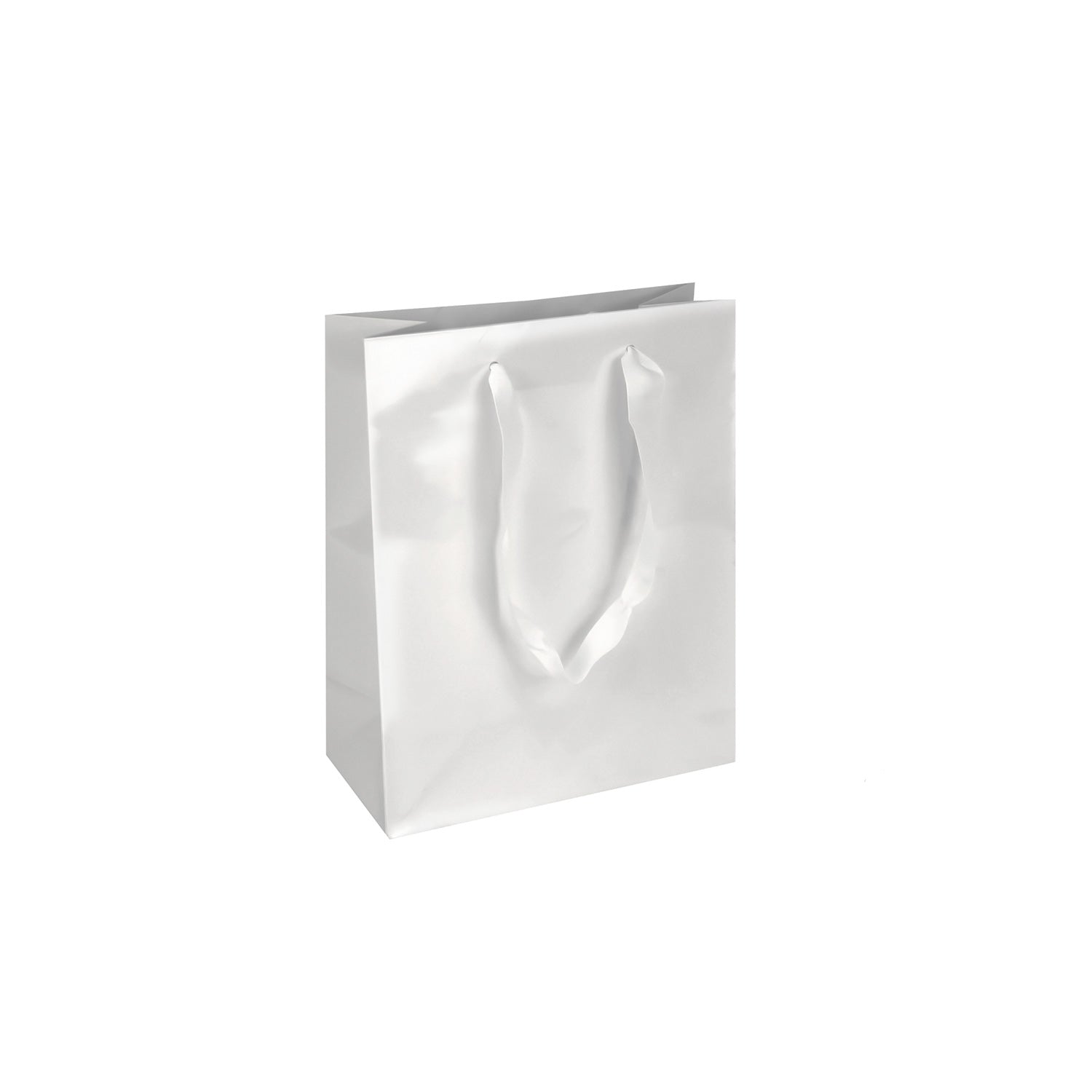 • Sleek, glossy laminated paper bags with satin ribbon handles—perfect for luxury retail and stylish gifting. Durable, chic, and reusable. Available in multiple colors and sizes.