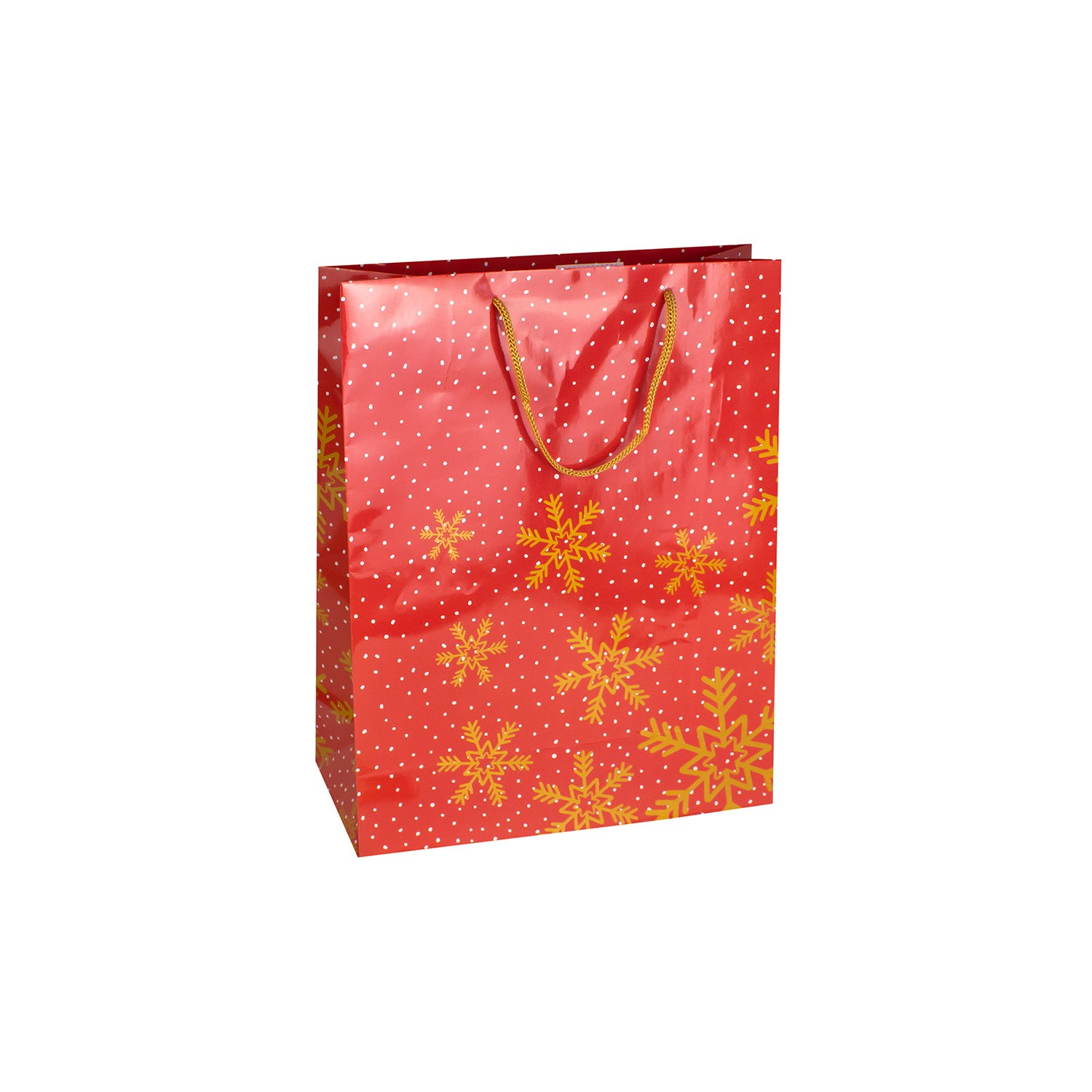 Make your holiday gifts shine with these red gift bags featuring gold snowflakes and matching rope handles. Festive, sturdy, and available in multiple sizes—perfect for spreading cheer.