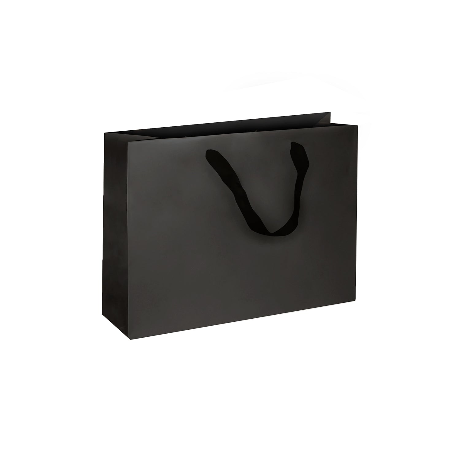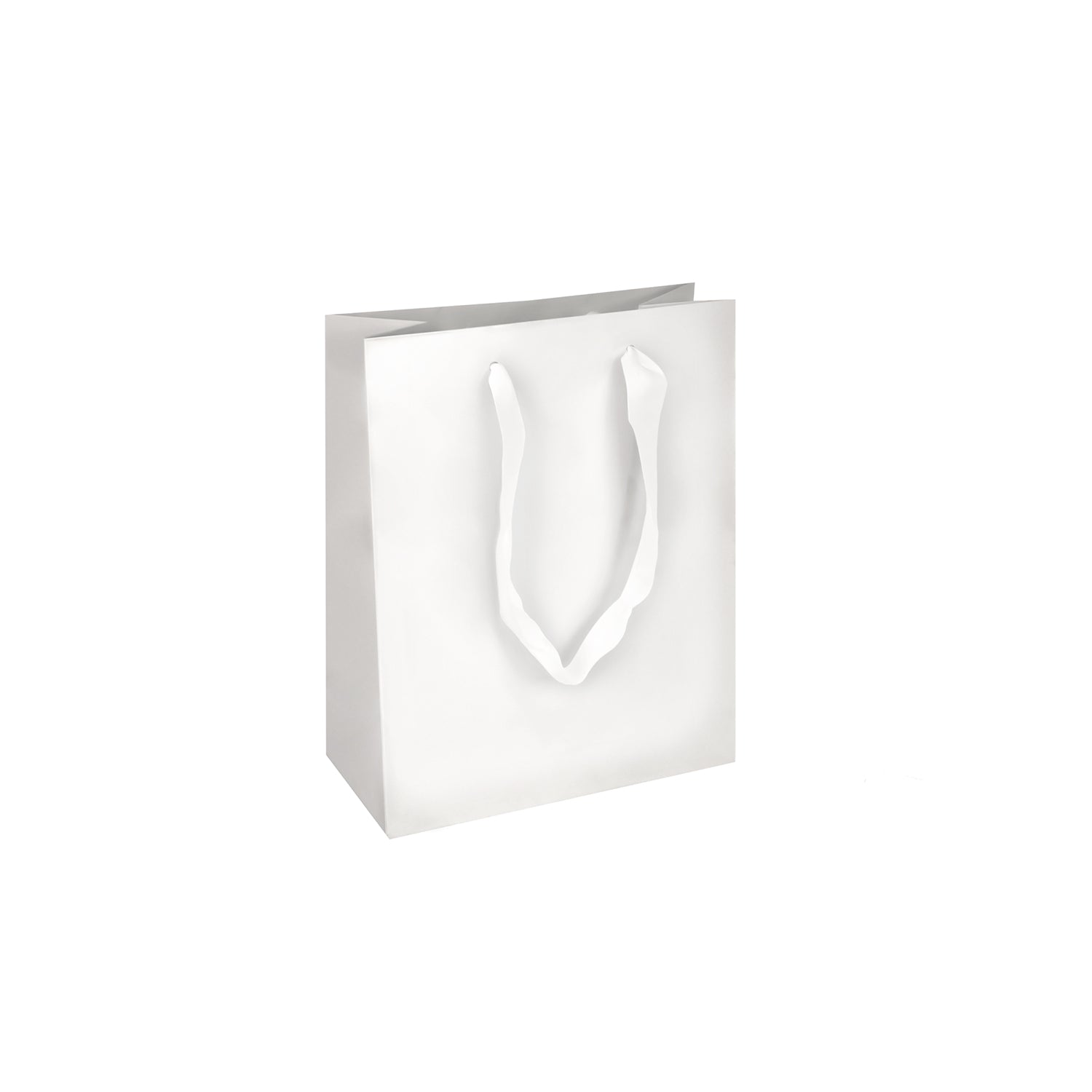 • These matte laminated paper bags with soft ribbon handles offer a modern, elegant touch for retail or events. Strong, stylish, and reusable. Available in multiple colors and sizes.