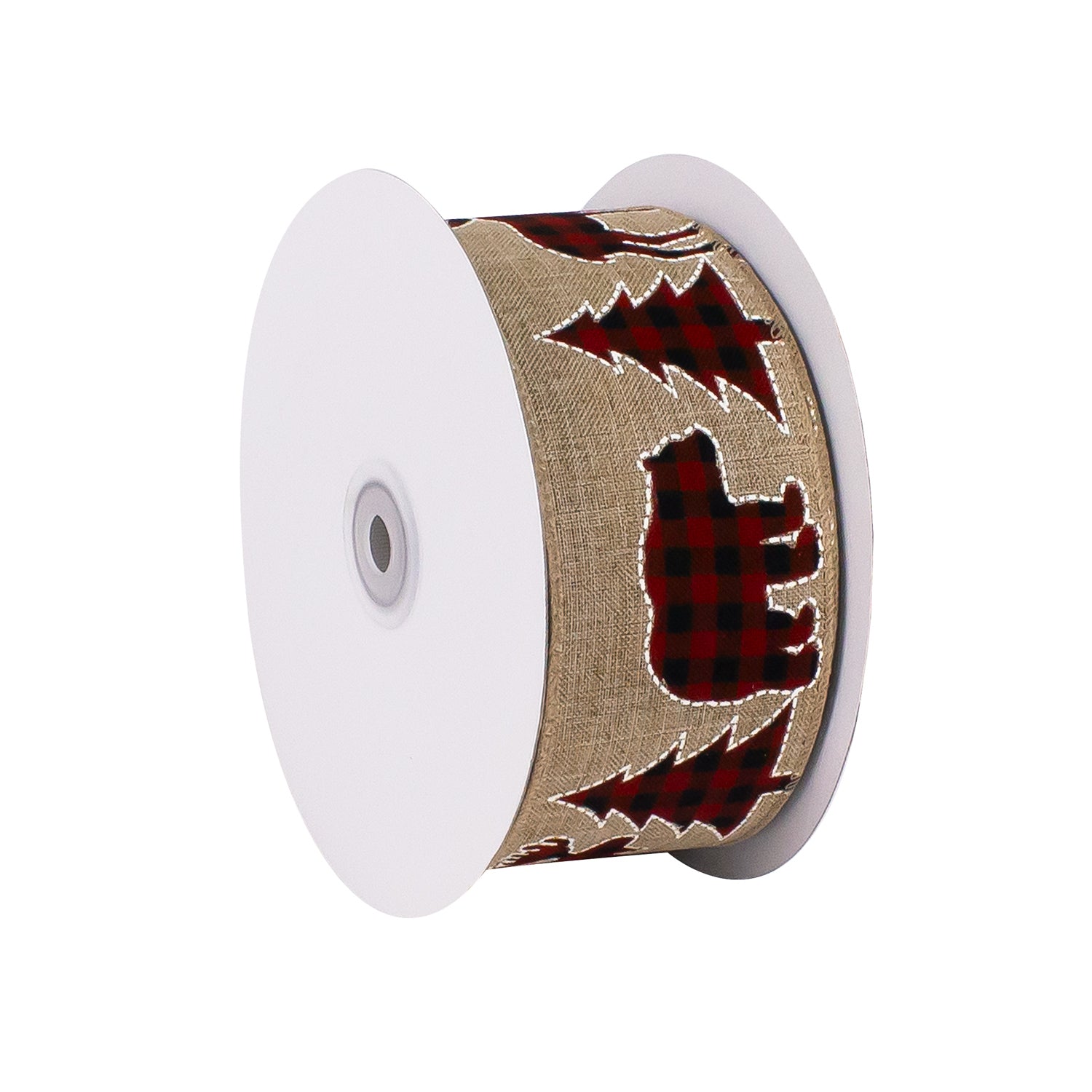 Bring rustic charm to your holiday décor with this cozy ribbon featuring buffalo plaid bears and trees on a natural burlap background. Perfect for gift wrapping, wreaths, and cabin-themed crafts, it adds a warm and festive woodland touch to any seasonal setting.