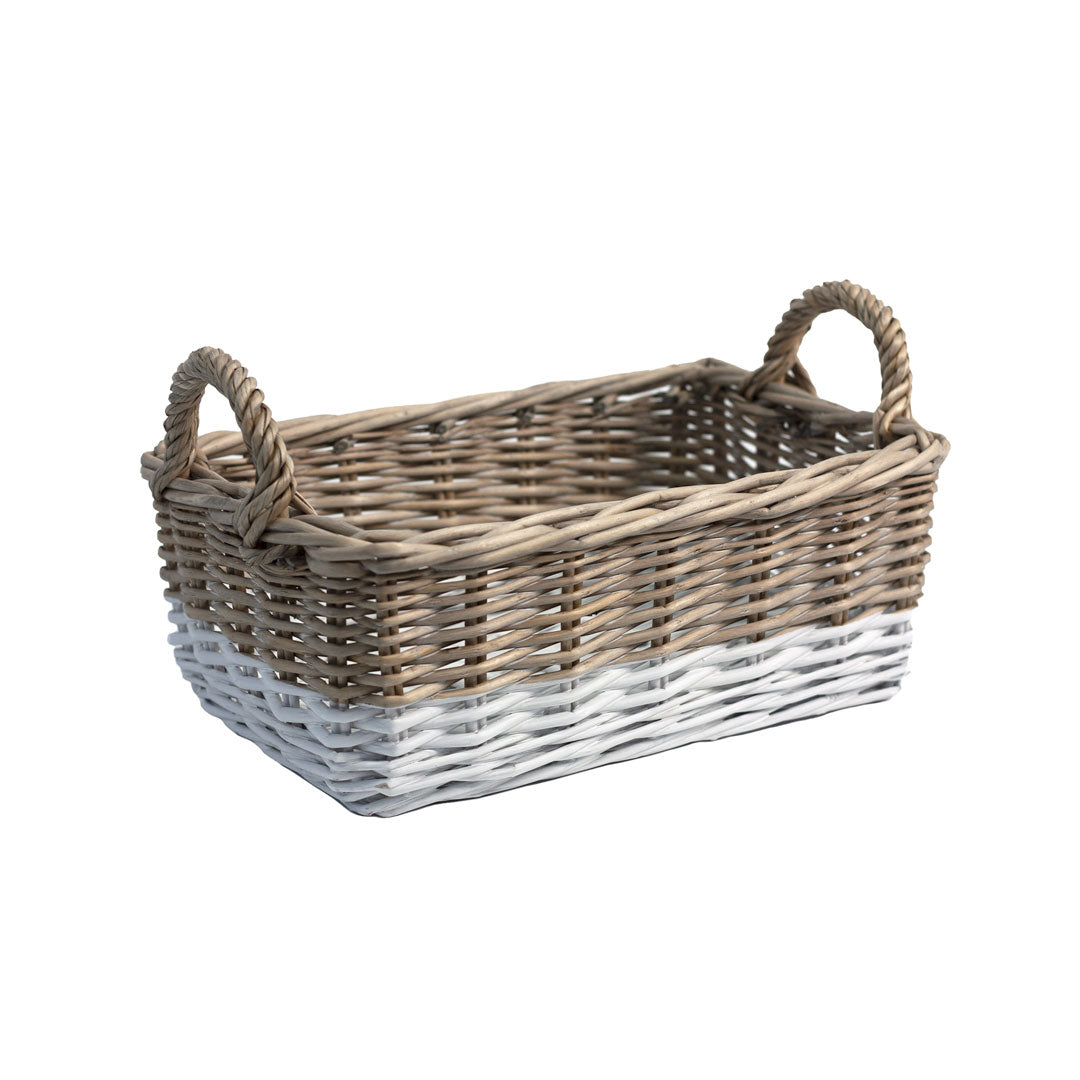 A rectangular woven basket with soft white accents for décor and storage. Keeps small items organized while adding a clean, charming touch to shelves, counters, or any room.